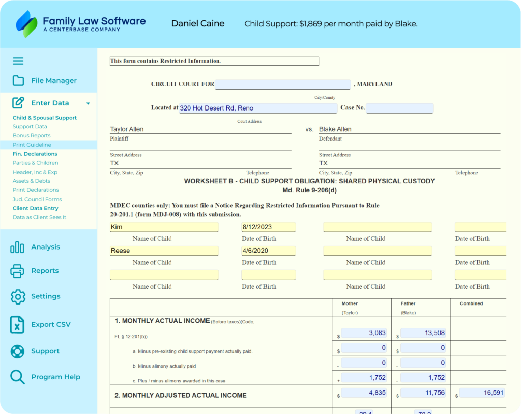 The software is fully up to date with the latest guidelines. Data you enter for child support flows to the Form 301 (Rule 401) Financial Statement as well as the Child Support Guidelines Worksheet.